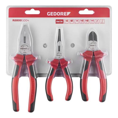 Jogo de Alicates Gedore Red com 3 peças: Alicate Universal 200mm 8 , Alicate diagonal 165mm 6.1/2 , e Alicate de bico 165mm 6.1/2 . Com o Jogo de Alicate Gedore Red R2800 1004 você terá as principais ferramentas para diversas tarefas em sua casa. Este kit oferece grande versatilidade, sendo essencial para estar preparado para diversas situações. É recomendado para qualquer pessoa ou . O Alicate universal deste kit proporciona uma excelente pressão no uso, com lâmina de corte afiada e precisa, podendo ser utilizado para cortar e apertar objetos como fios, cabos, arames, cobre, latão, além de prensar terminais devido à sua alta resistência e força. O Alicate de corte diagonal é específico para cortar objetos, com lâminas precisas e afiadas e um cabo que oferece uma boa acomodação para a ação do corte. O Alicate de bico, também conhecido como alicate do tipo telefone, tem bico semi-redondo, longo e reto, com dentes em , permitindo cortar, puxar, segurar e dobrar fios, sendo ideal para áreas de difícil acesso e com pouco espaço de trabalho. Todas as ferramentas deste kit são fabricadas com materiais resistentes, proporcionando uma longa vida útil. Para maior segurança, os alicates possuem cabo emborrachado, garantindo um manuseio confortável e prevenindo que a ferramenta escorregue das mãos. Informações técnicas e características: Marca: Gedore Linha: Red Componentes: Alicate Universal 200mm 8 , Alicate diagonal 165mm 6.1/2 , e Alicate de bico 165mm 6.1/2 Modelo: R2800 1004 Material: Fabricado em aço Gedore Red Norma Atendida: DIN/ISO Referência: FEG0145 Aplicações: Reparo de Equipamentos Domésticos, Projetos de Bricolagem, Manutenção de Veículos, Trabalhos Elétricos e Eletrônicos, Uso em Oficinas e Garagens, Projetos de DIY Faça Você Mesmo , Trabalhos de Construção, Instalações e Reparos Gerais, Projetos de Carpintaria e Marcenaria, Uso em Ambientes Profissionais de Manutenção, Ferramentas para Emergências Domésticas, Trabalhos em Jardinagem e Paisagismo, Atividades de Reparo e Montagem de Móveis, Projetos de Artes e Artesanato.