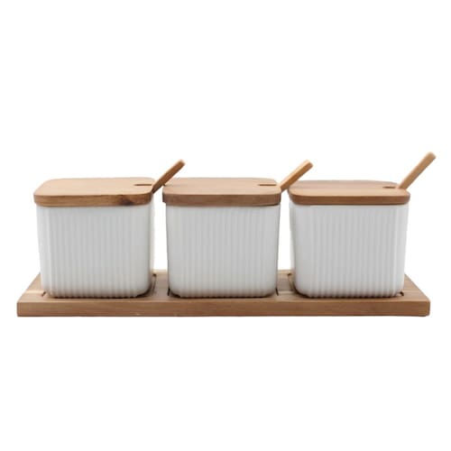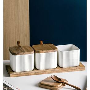 Jogo 3 Porta Condimento em Cerâmica Com Tampa De Bambu