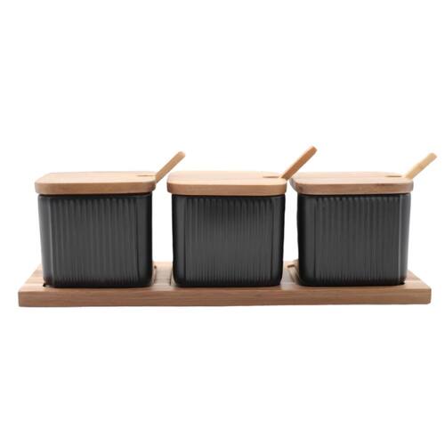 Jogo 3 Porta Condimento em Cerâmica Com Tampa De Bambu