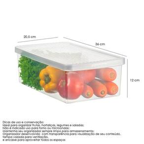 Por que devo adquirir esse organizador Com todas as qualidades que você merece e preço que cabe no seu bolso, foi desenvolvido para armazenar frutas, verduras e legumes no refrigerador. Possui tampa vazada que permite a circulação de ar, conservando o frescor dos alimentos por muito mais tempo. Além disso, permite empilhamento para otimizar o espaço no refrigerador. Transparente, possibilita uma rápida identificação do conteúdo. E pode ser utilizada não só para refrigerador, pode ser utilizada para qualquer organização que seja possível utilizar o produto.