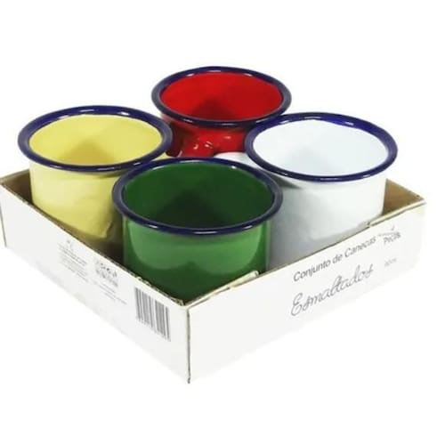 surpreenda seus convidados com esse lindo conjunto de canecas tenha a melhor das nostalgias com essas canequinhas, combina com qualquer ambiente para sua cozinha, sala. . . O kit vem sempre com 4 canecas de cores diferentes: branca, amarela, vermelha e verde. São lindas, ótimas para decoração e ideais para tomar café. Um toque vintage todo especial e charmoso para a sua cozinha. Cada caneca tem capacidade de 90 ml. A hora do café com mais requinte. - produto leve - kit com 04 canecas - podendo vir com algumas falhas na pintura, pois se trata de um produto frágil. - cores enviadas de forma , sem opção de escolha. Especificação: dimensões: 04 canecas de 5 cm de altura x 5,5 cm de diâmetro material: 10% revestimento em esmalte e 90% ferro