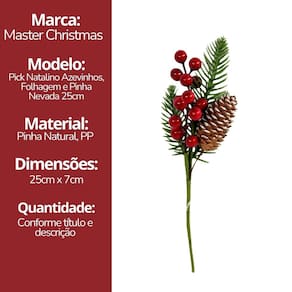 Dê mais charme e sofisticação à sua decoração de Natal com este galho decorativo estilo pick, composto por folhagens realistas, 1 pinha natural de 8cm com efeito nevado e azevinhos vermelhos vibrantes que trazem cor e vida ao ambiente.