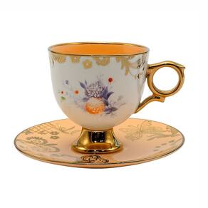 - Cor: Branco e laranja - Material: Porcelana - 4 Xícaras: Altura: 9 x Diâmetro: cm - 4 Pires: Ø14x2cm - Capacidade 200ml Marca: Não Informado