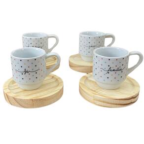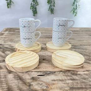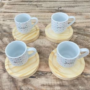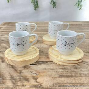 Jogo 4 xícaras Café c/ pires redondo - Frases Motivacionais - 80 ml Empilháveis - Poá Colorido Peças de porcelana feitas de material de alta qualidade, queimados em alta temperatura, o que os torna fortes, resistentes e com alto brilho, e deixa qualquer ambiente mais bonito e moderno.A porcelana tem uma enorme vantagem sobre outros materiais, pois é fácil de limpar e não absorve cheiro, o que deixa a peça e o ambiente livre de mal cheiro. Os desenhos são decalque aplicados e queimados junto à peça, o que os funde a peça, dão brilho e não desbotam com o tempo. Frases: Amor, Fé, Paz, Felicidade, Gratidão, Família.Forte resistente, podem ir ao micro-ondas.Ótimas para servir café com leite, Chá, água, refrigerante e bebidas em geral.São empilháveis, o que torna o armazenamento mais prático. OBS: Por se tratar de madeira de pinus natural, entre os pires podem existir pequenas variações na tonalidade das cores da madeiraPode haver variação de tonalidade entre as peças devido a diferentes lotes de queima. As palavras a serem enviadas na compra são aleatórias conforme disponibilidade no momento. Embalagem contêm 8 (4 xícaras e 4pires) Marca: Antilope Decor Porcelanas