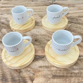 Jogo 4 xícaras Café c/ pires redondo - Frases Motivacionais - 80 ml Empilháveis - Poá Preto Peças de porcelana feitas de material de alta qualidade, queimados em alta temperatura, o que os torna fortes, resistentes e com alto brilho, e deixa qualquer ambiente mais bonito e moderno.A porcelana tem uma enorme vantagem sobre outros materiais, pois é fácil de limpar e não absorve cheiro, o que deixa a peça e o ambiente livre de mal cheiro. Os desenhos são decalque aplicados e queimados junto à peça, o que os funde a peça, dão brilho e não desbotam com o tempo. Frases: Amor, Fé, Paz, Felicidade, Gratidão, Família.Forte resistente, podem ir ao micro-ondas.Ótimas para servir café com leite, Chá, água, refrigerante e bebidas em geral.São empilháveis, o que torna o armazenamento mais prático. OBS: Por se tratar de madeira de pinus natural, entre os pires podem existir pequenas variações na tonalidade das cores da madeiraPode haver variação de tonalidade entre as peças devido a diferentes lotes de queima. As palavras a serem enviadas na compra são aleatórias conforme disponibilidade no momento. Embalagem contêm 8 (4 xícaras e 4 pires) Marca: Antilope Decor Porcelanas