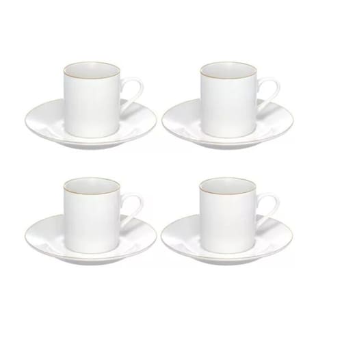 Espessura: 3mmCapacidade: 90mlMaterial: PorcelanaCor: Branco e DouradoMarca: HAUSKRAFTComposição do Produto:4 Xícaras: 8cm x 5,5cm x 6cm e 4 Pires: 13cm x 13cm x 1cm