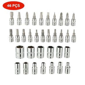 O jogo de ferramentas que você está se referindo é um kit de ferramentas que inclui 46 peças, todas elas projetadas para uso com uma chave catraca de 1/4 de polegada. Essas peças são usadas para fixar e soltar porcas, parafusos e outros tipos de fixações.