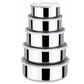 Jogo 5 Potes Inox com Tampa Conjunto Marmita Vasilha Refeiçao Alimento Armazenamento Empilhavel Organizaçao Multiuso