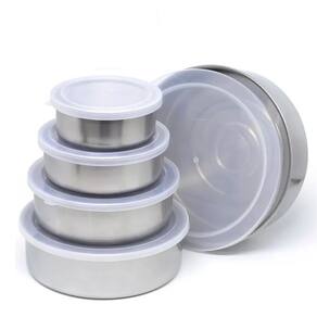 Jogo de potes fabricados em aço inox refinado e com tampa flexível. Possui cinco peças funcionais e versáteis, cada uma com um tamanho e capacidade diferentes.