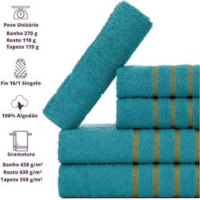 Composição - 2 Toalhas de Banho + 2 Toalhas de Rosto + 1 Tapete PisoGramatura - 330 G/m Peso Toalha de Banho - 290 a 300 Gramas Peso Toalha de Rosto - 110 a 120 GramassTamanho Toalha de Banho - 70x130 cm Tamanho Toalha de Rosto - 45x70 cm Fio - 16/1