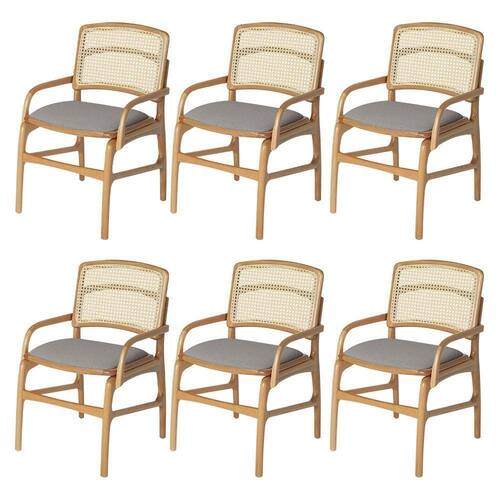 AS IMAGENS SÃO MERAMENTE ILUSTRATIVAS E PODEM SOFRER VARIAÇÕES DE COR E PEQUENOS DETALHES DE ACORDO COM O SEU MONITOR, ILUMINAÇÃO DO AMBIENTE E ATÉ MESMO A SUA PERCEPÇÃO VISUAL.Jogo 6 Cadeiras para Jantar FlorenÃa em Madeira Jequitibà Natural BraÃo Encosto Palha Linho Cinza