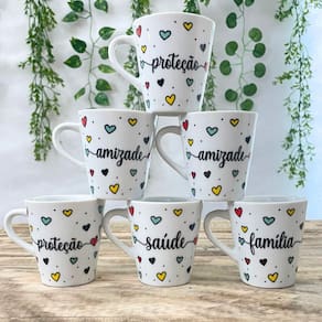Jogo 6 canecas Cônicas 120ml Frases Motivacionais -PorcelanaContém 6 canecas com design bem interessante, você pode presentear as pessoas que você gosta. Frases: Família, Proteção, Amizade, Saúde, Seja Luz, Amor, Gratidão, Fé, Paz, Sucesso e Felicidade.