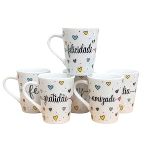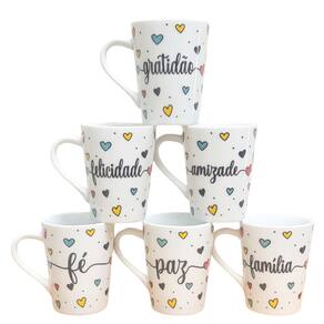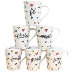 Jogo 6 canecas Cônicas 220ml Frases Motivacionais -PorcelanaContém 6 canecas com design bem interessante, você pode presentear as pessoas que você gosta. Frases: Amor, Fé, Paz, Felicidade, Gratidão, Família.Forte resistente, pode ir ao micro-ondas. Ótimas para servir café com leite, água e bebidas em geral. Decalques com queima e fixação em alta temperatura, o que dá um brilho e charme há qualquer ambiente.OBS: Embalagem contem 6 unidades Marca: Antilope Decor Porcelanas