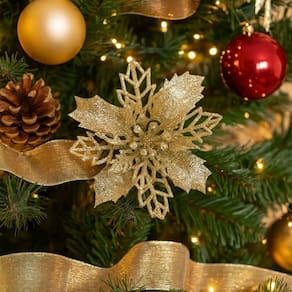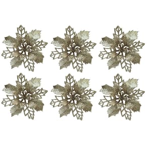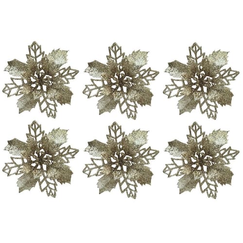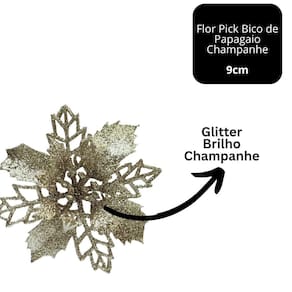 Adicione um toque de brilho e sofisticação à sua decoração natalina com este jogo com 6 flores bico de papagaio modelo pick. Com acabamento em glitter champanhe e design delicado, são perfeitas para realçar guirlandas, arranjos florais, árvores de Natal, embrulhos especiais ou qualquer composição decorativa temática.