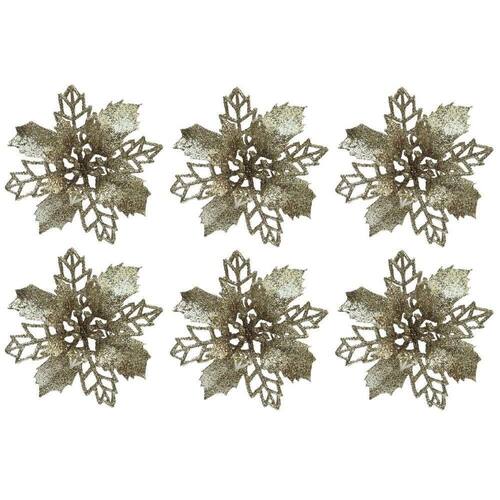 Flor Bico de Papagaio Natalina com Glitter Champanhe Pick com Presilha 9cm (Jogo com 6 unidades)