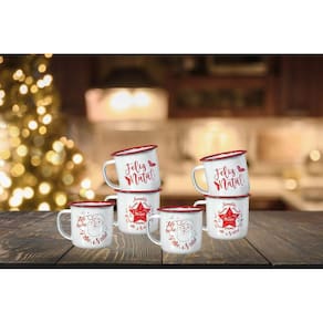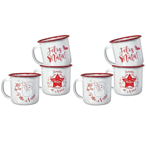 Jogo exclusivo com 6 unidades de canecas esmaltadas com 3 estampas natalinas diferentes! As canecas possuem a cor branca com estampa em vermelho, assim como sua borda!