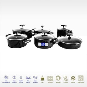 Jogo 6 Panelas Cerâmica Indução Tampa De VidroConjunto de Panelas 6 Peças Aço Fundido com Cerâmica e Tampa de Vidro inquebrável Preta - RoyaleSua Cozinha merece produtos de alta QualidadeO Conjunto possui revestimento especial em vitro cerâmica, confeccionada para resistir as temperaturas e evitar contaminação por germes e bactérias.Cozinha eficientemente e mantém o calor economizando até 40% do gás.Fácil de Limpar e permanecem bonitas por mais tempo.Material: Aço Ferromagnético Fundido a 850.C com Cerâmica de Alta Qualidade.Pode ser levado ao Freezer, Lava Louças, Fogão A Gás, Elétrico, por Indução e a Lenha.Composição:1 Caçarola com tampa de vidro 25cm1 Caçarola com tampa de vidro 22cm1 Frigideira com tampa de vidro 24cm1 Panela com tampa de vidro 18cm1 Panela com tampa de vidro 20cm1 Leiteira com tampa de vidro 16cmCaracterísticasAmbiente: CozinhaModelo / Tipo: Conjunto de PanelasMedida Externa AxLxP :23.5x40.5x66cmMaterial: Aço, CerâmicaCor: PretoCabo: BaquelitePeso: 5klsTipo de Uso: Dia a DiaQuantidade de Peças: 6Garantia: Defeito de Fabricação
