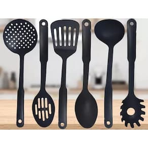 As tarefas da cozinha podem ficar mais fáceis com o prático Conjunto de Utensílios 6 peças feitas em nylon resistente ao calor (indicado para ate 180°Celsius) e com funções especificas para diferentes atividades. Composto por escumadeira, concha, espátula vazada, colher para arroz, colher vazada e pegador de massa;