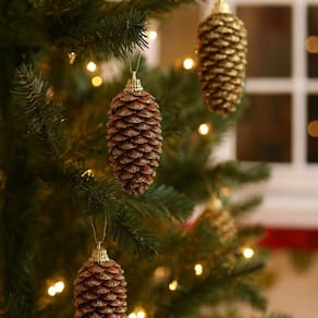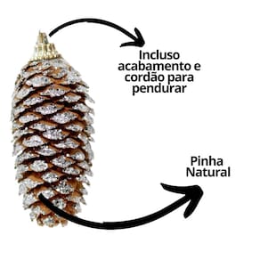 Cada pinha mede 8,5cm de altura x 3cm de largura e já vem com cordão para pendurar, garantindo praticidade na hora de montar a decoração. Produzidas a partir de pinhas naturais, elas recebem acabamento em glitter que proporciona brilho festivo sem perder a essência rústica do material.