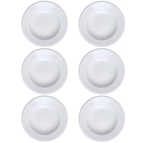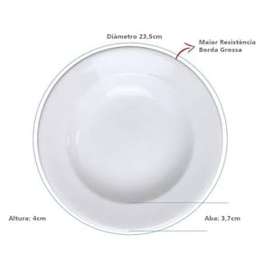 Garantia: 90 dias / Peso: 4,29kg / Cor predominante: branco / Referência: 7891658934433X6 Dimensões de cada prato: 23,5cm (D) x 4cm (A); Capacidade de cada prato: 350ml; Tipo: fundos; Conteúdo: 6 pratos; Material: porcelana.