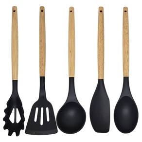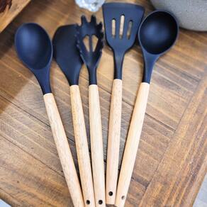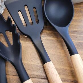 Jogo 6 Utensílios Cozinha Silicone Preto Cabo Madeira 30cm