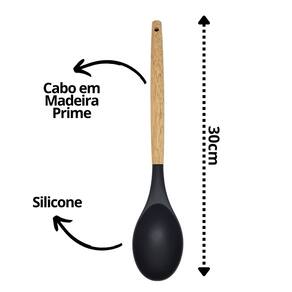 Transforme suas experiências culinárias com o Jogo de Utensílios de Cozinha em Silicone Preto com Cabo de Madeira Prime. Uma escolha perfeita para quem busca funcionalidade e estilo na cozinha!