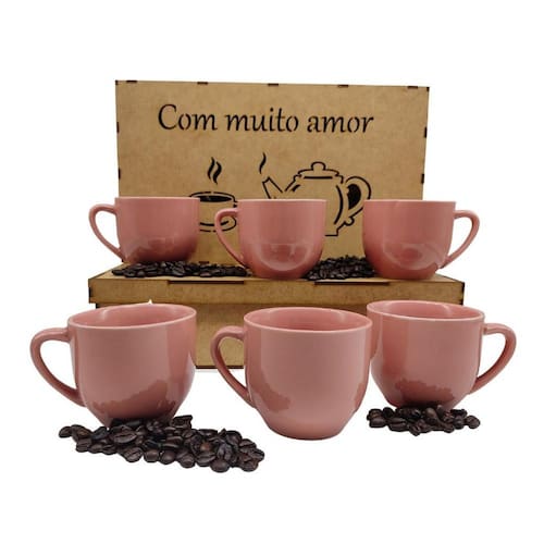 Jogo 6 xicaras 170ml porcelana para café chá caixa mdf rosa Jogo 6 xicaras de porcelana para café chá 170ml caixa em mdf decorada