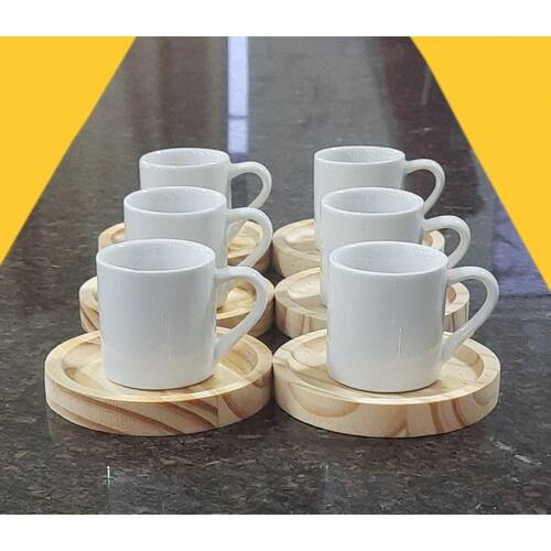 A porcelana tem uma enorme vantagem sobre outros materiais, pois é fácil de limpar e não absorve cheiro, o que deixa a peça e o ambiente livre de mal cheiro. São resistentes ao forno e micro-ondas. Cor Branca Capacidade 80ml OBS: Por se tratar de madeira de pinus natural, entre os pires podem existir pequenas variações na tonalidade das cores da madeira.