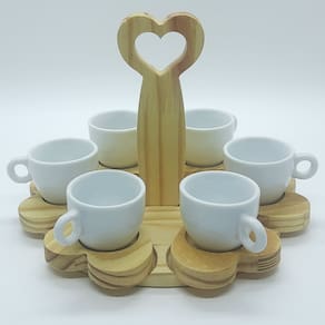 kit Jogo 6 xícaras café Cônica 80ml com suporte e pires coração  - Porcelana branca