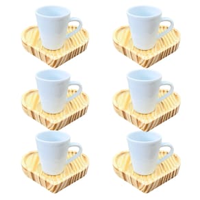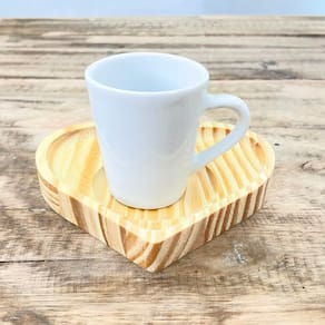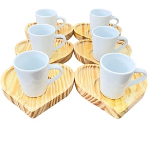 Jogo 6 xícaras café expresso 55ml Porcelana c/ pires coração Peças de porcelana feitas de material de alta qualidade, queimados em alta temperatura, o que os torna fortes, resistentes e com alto brilho, e deixa qualquer ambiente mais bonito e moderno. Nova tendência, mistura de porcelana com madeira, charmosa e moderna para servir em xícaras para todos de sua casa e receber as visitas e amigos. A porcelana tem uma enorme vantagem sobre outros materiais, pois é fácil de limpar e não absorve cheiro, o que deixa a peça e o ambiente livre de mal cheiro. Ótimas tambem para padarias, cafeterias, buffetts e restaurantes São resistentes ao forno, micro-ondas e lava-louças. Cor Branca Capacidade 55ml OBS: Por se tratar de madeira de pinus natural, entre os pires podem existir pequenas variações na tonalidade das cores da madeira. Pode haver variação de tonalidade entre as peças de porcelana devido a diferentes lotes de queima. Embalagem contêm 12 peças (6 xícaras e 6 pires) Marca: Antilope Decor Porcelanas