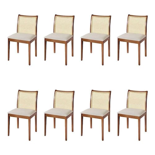 AS IMAGENS SÃO MERAMENTE ILUSTRATIVAS E PODEM SOFRER VARIAÇÕES DE COR E PEQUENOS DETALHES DE ACORDO COM O SEU MONITOR, ILUMINAÇÃO DO AMBIENTE E ATÉ MESMO A SUA PERCEPÇÃO VISUAL.Jogo 8 Cadeiras de Jantar Juliana Jequitibà Terra em Madeira MaciÃa Encosto Palha Linho Bege