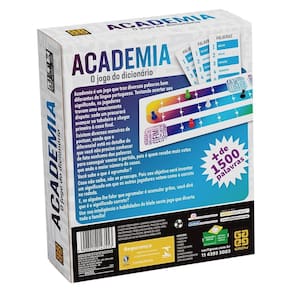 Academia é um jogo que traz diversas palavras bem diferentes da língua portuguesa. Tentando acertar seu significado, os jogadores travam uma emocionante disputa: cada um procurará avançar no tabuleiro e chegar primeiro à casa final.Existem diversas maneiras de pontuar, sendo que o diferencial está no detalhe de que você não precisa conhecer de fato nenhuma das palavras para conseguir vencer a partida, pois é quem recebe mais votos que anda o maior número de casas.Você sabe o que é um agrumularCaso não saiba, não se preocupe. Pois seu objetivo será inventar um significado em que os outros jogadores votem como o correto na rodada Homologação Inmetro: CE-BRI/ICEPEX-N 01264-25-14 Marca: Não Informado Ean: 7908010143553