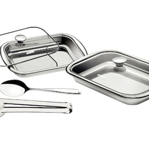 Todas Informações abaixo são fornecidas pela Tramontina para maiores esclarecimento e transparências aos nossos clientes! Referência : 64310150 Composição: 1 Assadeira com tampa de vidro Cosmos 39 cm 1 Assadeira com tampa de vidro Cosmos 34 cm 1 Colher para arroz 1 Pegador para massa Informações Técnicas: Kit para assar e servir 4 peças Cosmos. Peso Líquido: 2,6350 kg. Peso Bruto: 2,9850 kg. Metragem: 0,013583 m³. Dimensões Embalagem (Compr. X Larg. X Alt.): 539x 420x 60 mm. Dimensões Produto (Compr. X Larg. X Alt.): 539x 420x 60 mm. Kit para assar e servir em aço inox, com tampa de vidro. Informações Adicionais: Peças feitas em aço inox, mantêm suas características originais, preservando a beleza, a higiene e a durabilidade do material. Acabamento em brilho. Design moderno proporciona requinte ao compor a mesa. Ideal para assar e servir. Podem ser lavadas diariamente na máquina de lavar louças. Com tampa de vidro transparente que permite a visualização dos alimentos. Informações Importantes: Use apenas sabão ou detergente e uma esponja macia. Outros tipos de produto como palha de aço, poderão riscar ou prejudicar o brilho das peças. Enxágue cada item a fim de remover totalmente os resíduos dos produtos de limpeza, que, por serem abrasivos, podem danificar o inox. Sempre que possível, use água quente, pois renova o brilho das peças. Após a lavagem, enxugue imediatamente as peças, caso contrário, as substâncias químicas da água (cloro) poderão causar manchas. Evite atrito entre as peças durante o processo de lavagem e no armazenamento, para mantê-las sem riscos. Evite o contato do produto com superfícies quentes, pois elas provocam a descoloração do material. Não guarde as peças em locais úmidos. A umidade também provoca manchas Ean: 7891116070390