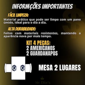 Itens Inclusos: - 02 SOUSPLAT ( JOGO AMERICANO ) DE 40CM - 02 Guardanapos 35cm x 35cm