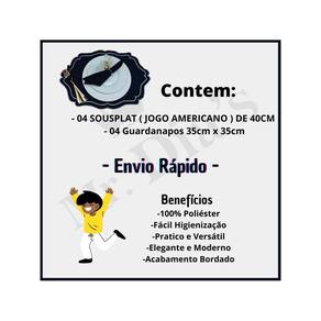 Itens Inclusos: - 04 SOUSPLAT ( JOGO AMERICANO ) DE 40CM - 04 Guardanapos 35cm x 35cm