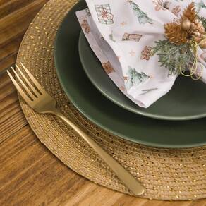 Jogo Americano Copa E Cia 6 Peças Greta Gold Jogo Americano Copa e Cia 6 Peças Greta Gold - Características Gerais do Produto: - Composição: 75% Polipropileno (Plástico) e 25 % Poliéster. - Detalhes: Kit Contém 06 peças.; Produto Flexível.; Armazenar o produto aberto e na horizontal; São práticas e versáteis - Cuidados: Limpar Manualmente, Armazenar em Local Seco e Arejado.; Não Torcer, Amassar, Dobrar ou Molhar Totalmente o Produto.; Limpar o Produto Apenas com Pano Levemente Umedecido; Evitar contato com objetos cortantes ou superaquecidos.; Não utilizar solventes, abrasivos ou alvejantes. - Dimensões (cm): Diâmetro: 38 cm Acompanha o produto: - 6 Peças de Jogo Americano Garantia: - Sem Garantia
