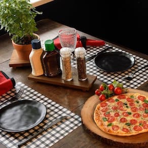 Jogo Americano Copa E Cia 6 Peças Pp Flex Vichy Jogo Americano Copa e Cia 6 Peças PP Flex Vichy - Características Gerais do Produto: - Composição: Composto por polipropileno (plástico) na superfície e verso de feltro. - Detalhes: Kit Contém 06 peças.; Peças Práticas, Resistentes e Destinadas ao uso Diário.; Armazenar o produto aberto e na horizontal; Verso que evita escorregões e riscos na sua mesa. - Cuidados: Não Torcer, Amassar, Dobrar ou Molhar Totalmente o Produto.; Não Utilizar Solventes ou Abrasivos.; Evitar contato com objetos cortantes ou superaquecidos.; Limpar manualmente com pano úmido e detergente neutro. - Dimensões (cm): Comprimento: 44,00 cm; Largura: 28,5 cm Acompanha o produto: - 6 Peças de Jogo Americano Garantia: - Sem Garantia