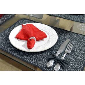 Jogo americano fabricado em tecido matelado, nas cores branco e preto, com desenhos de folhas matelado na cor branco, detalhe de um lindo laço na cor preto para guardar os talheres e acabamento em viés na cor preta.