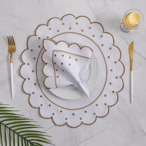 Jogo americano poá 12 peças - marfim bordado dourado A linha jogos americanos bordado possui um design elegante e charmoso com cores neutras e delicadas que dão um toque especial na mesa. Ele é versátil e combina com diversos tipos de ocasiões e compondo diferentes tipos de mesa. Devolvido em tecido, acabamento bordado. Complete o visual da sua mesa. Esse lindo americano alia perfeitamente qualidade e beleza. características:- 100% poliester - fácil higienização; - prático e versátil; - elegante e moderno; - acabamento bordado - quantidade de peças 12 peças itens inclusos:- 06 sousplat jogo americano de 40cm x 40cm - 06 guardanapos 35cm x 35cm composição:- material 100% poliester