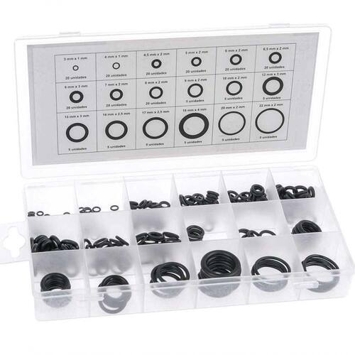 1 Estojo plástico com 225 peças, sendo: 20 peças 3 mm x 1 mm, 20 peças 4 mm x 1 mm, 20 peças 4,5 mm x 2 mm, 20 peças 5 mm x 2 mm, 20 peças 6 mm x 2 mm, 20 peças 6,5 mm x 2 mm, 20 peças 6 mm x 3 mm, 20 peças 7 mm x 2 mm, 20 peças 8 mm x 2 mm, 5 peças 9 mm x 2 mm, 5 peças 10 mm x 2 mm, 5 peças 12 mm x 3 mm, 5 peças 13 mm x 3 mm, 5 peças 14 mm x 2,5 mm, 5 peças 17 mm x 2,5 mm, 5 peças 18 mm x 4 mm, 5 peças 20 mm x 2 mm, e 5 peças 22 mm x 2 mm.