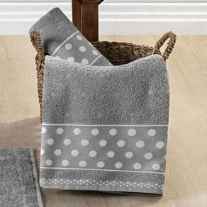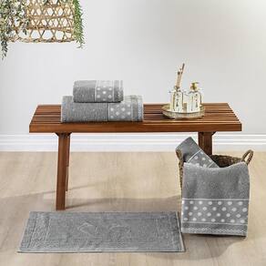 Jogo de Banho Meggy Poá Bolinhas Toalhas Macias 100% Algodão 5 Peças - Cinza Granito Descubra o toque macio e o design elegante do Jogo de Banho Meggy Poá. Composto por 5 peças essenciais - 2 Toalhas de Banho, 2 Toalhas de Rosto e 1 Piso, este conjunto foi pensado para elevar a sua experiência diária de autocuidado, proporcionando conforto e sofisticação.