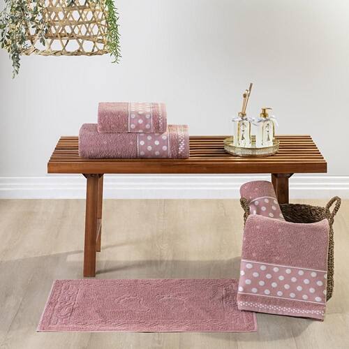 Jogo de Banho Meggy Poá Bolinhas Toalhas Macias 100% Algodão 5 Peças - Rosê Descubra o toque macio e o design elegante do Jogo de Banho Meggy Poá. Composto por 5 peças essenciais - 2 Toalhas de Banho, 2 Toalhas de Rosto e 1 Piso, este conjunto foi pensado para elevar a sua experiência diária de autocuidado, proporcionando conforto e sofisticação.