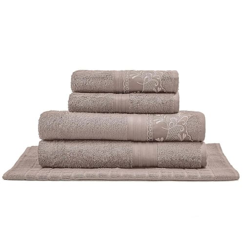 Possuem alta absorcao, e seu volume destaca um tom de charme e nobreza, proporcionando uma linda exposicao no banheiro, trazendo refinamento e muita sofisticacao ao ambiente. Composição 100% algodao Contem 5 pecas 02 toalhas banhao 81 x 150 cm 02 toalhas rosto 50 x 80 cm 01 piso Domus 50 x 80 cm Marca: Não Informado
