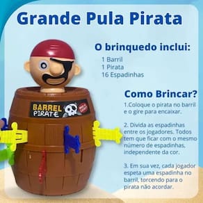 Barril pirata O barril do pirata é um brinquedo clássico e superdivertido que garante risadas e emoção para toda a família. O objetivo é simples: cada jogador insere uma espada no barril e, a qualquer momento, o pirata pode saltar para fora, surpreendendo a todos um jogo de sorte e suspense que estimula a interação, a concentração e a coordenação motora das crianças. Ideal para brincar em grupo, em festas, encontros familiares ou como presente no dia das crianças, natal e aniversários. Conteúdo da embalagem 1 barril do pirata 1 boneco pirata 24 espadas coloridas Características Brinquedo interativo e educativo Estimula a coordenação motora e a atenção Ideal para brincar em grupo e em família Fácil de jogar, não requer montagem complexa Design colorido e divertido que chama a atenção das crianças Perfeito como presente para meninos e meninas Especificações Material: plástico resistente e atóxico Idade recomendada: a partir de 3 anos Número de jogadores: 2 ou mais Dimensões aproximadas do barril: 15 cm x 10 cm Cores das espadas: variadas Produto leve e portátil Garanta já o barril do pirata e proporcione momentos de diversão, suspense e muitas risadas para toda a família Marca: Não Informado