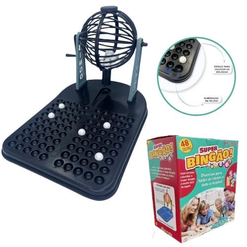 Esse jogo deixa qualquer encontro em família mais alegre e divertido, brincadeira que envolve desde as crianças até os mais velhos. Vem com 48 cartelas e 90 bolinhas, numeração em relevo na bandeja de números. Globo em plástico resistente, basta girar e acionar a mini alavanca para liberar a bolinha sorteada.
