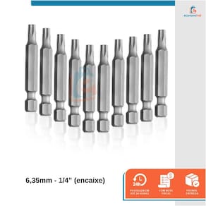 O Jogo Ponta Torx 30 50mm Cromo Vanádio da Starfer é um conjunto de 10 pontas de parafuso feitas de aço cromo vanádio resistente. Cada ponta tem um encaixe de 1/4" (6,35mm), mede T30 e possui um comprimento de 50mm. Essas pontas são ideais para uso em parafusadeiras, tornando mais fácil apertar ou soltar parafusos. Este jogo de pontas é uma ferramenta prática e confiável para uma variedade de tarefas de fixação e montagem.