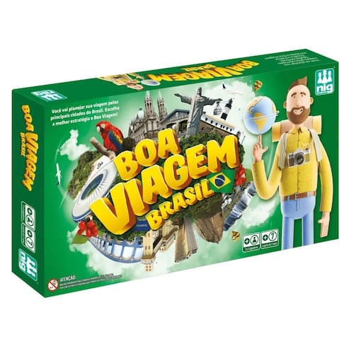 Jogo Boa Viagem - Brasil- Nig Brinquedos Embarque em uma aventura pelo Brasil com o Jogo Boa Viagem Brasil da Nig Brinquedos! Parte da linha de jogos educativos da marca, este jogo oferece um emocionante tour pelas principais cidades do país, com belas imagens, referências culturais importantes e curiosidades sobre cada destino. Cada jogador planeja sua viagem, escolhe os meios de transporte e precisa administrar o dinheiro recebido para completar o trajeto em primeiro lugar. Uma maneira divertida e interativa de explorar o Brasil, desenvolvendo habilidades de planejamento e estratégia. Boa viagem e que vença o melhor viajante! Código: 103600 Dimensões aprox. da embalagem em cm: 6x42x24 Peso liq. Aproximado do produto na embalagem: 444g Referência do modelo: 1105 Conteúdo da embalagem: 01 tabuleiro, 02 dados, 04 peões, 84 cartões postais, 14 carnês de viagem, Notas lúdicas, manual Garantia: 90 dias contra defeitos de fabricação pelo fabricante. Imagens meramente ilustrativas. As cores e tonalidades podem variar. Gênero - Meninas Meninos Unissex Idade - 7 anos 8 Anos 9 anos 10 Anos 11 Anos A partir de 12 Anos Tipo - Conhecimentos Gerais Estratégia Habilidade Jogo Pedagógico Kit Experiências Raciocínio Lógico Sorte