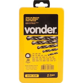 Conteúdo da embalagem1 Jogo de brocas de aço rápido DIN 338, com 29 peças, sendo: 1/16 5/64 3/32 7/64 1/8 9/6 5/32 11/64 3/16 13/64 7/32 15/64 1/4 17/64 9/32 19/64 5/16 21/64 11/32 23/64 3/8 25/64 13/32 27/64 7/16 29/64 15/32 31/64 1/2aplicações e dicas de usoIndicado para metais ferrosos e não ferrosos. Recomenda-se utilizar fluído/óleo de corte para lubrificação e resfriamento, aumentando a vida útil da broca.Destaques e diferenciaisProduzido em aço rápido, proporcionando maior resistência e durabilidade. Possui caixa metálica que facilita a acomodação e organização. DETALHES TÉCNICOS Números de peças do jogo de brocas: 29 peças Tipo de hélice da broca: Normal Norma DIN:338 Tipo de canal da broca: Helicoidal Tipo de haste da broca: Paralela/cilíndrica Ean: 7893946008994