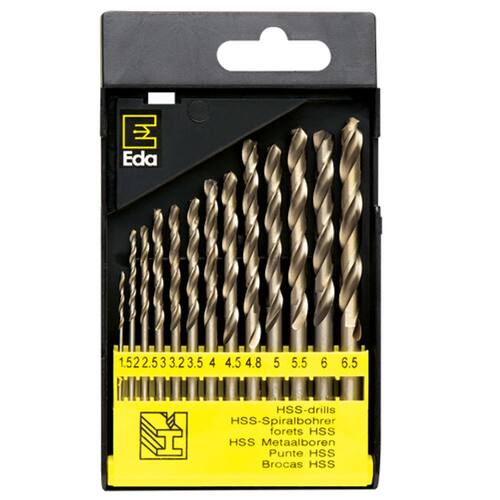 Jogo de brocas com 13 peças aço rápido 1/16" - 1/4" - eda Jogo de brocas em aço rápido para metal 13 peças 9lz eda As brocas eda são de excelente qualidade, da linha profissional da eda e acompanham prático estojo plástico para transporte e organização das brocas. O kit contém treze diferentes medidas para completar seu jogo de acessórios. - marca: eda - modelo: 9lz - em aço rápido - para uso em metais - com 13 brocas de 1/16' a 1/4' - linha profissional - com estojo de plástico para transporte e organização das brocas - peso bruto: 125 g - : 90 dias Ean: 7895315013905