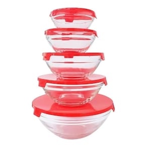 Jogo c/5 porta mantimentos de vidro tigelas potes com tampa Cor: vermelho Nome do produto: jogo c/5 porta mantimentos de vidro tigelas potes com tampa Jogo de potes de vidro 5 peças ad-0147